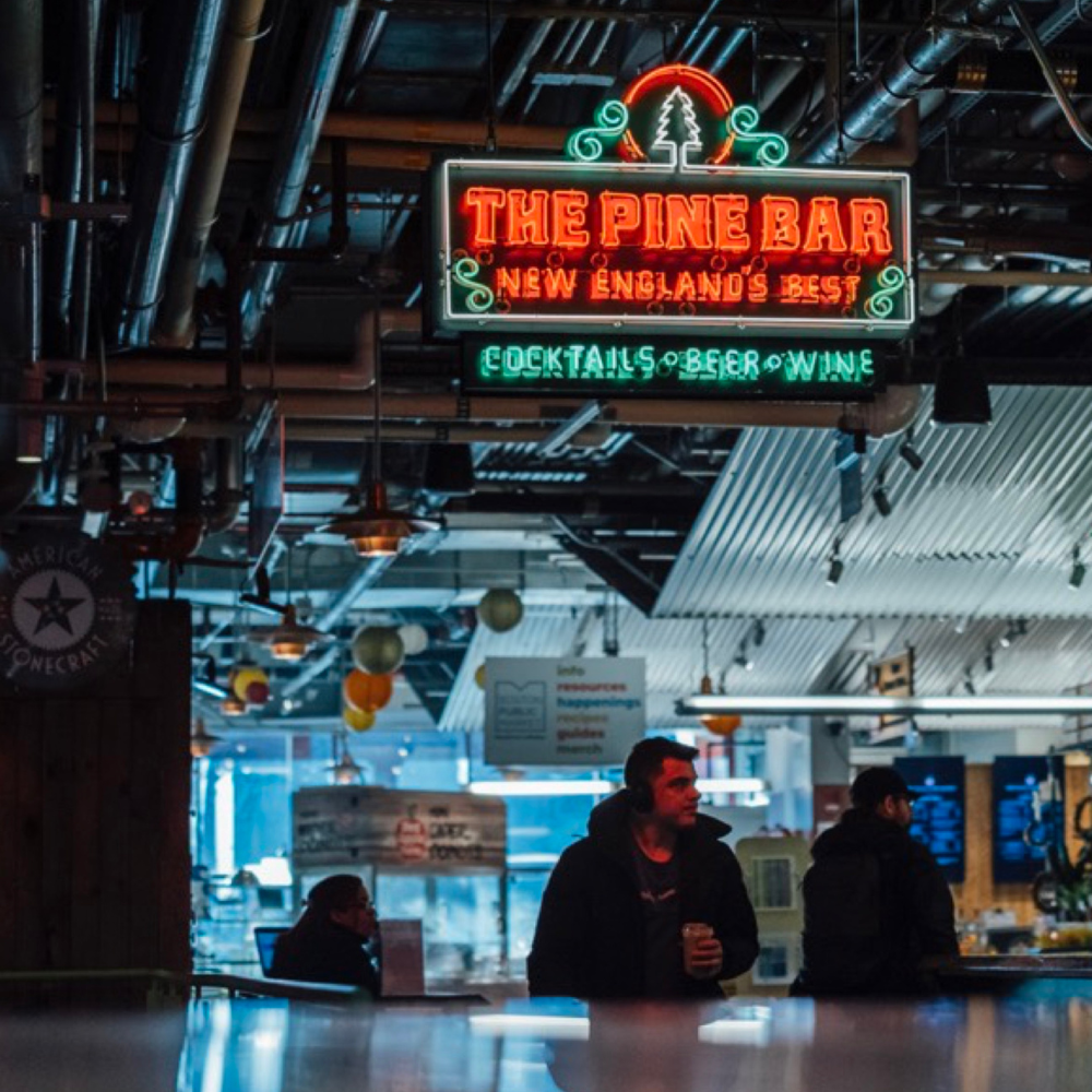 The Boston Public Market is proud to be home to The Pine Bar, a full-service cocktail bar serving beers, wines, and spirits made in New England. The Pine Bar patrons and Boston Public Market visitors can pull up a stool at the bar to enjoy their beverages, or place an order and wander the Market drink-in-hand. Hungry patrons can also purchase food from any Boston Public Market vendor to enjoy at the bar alongside their local libations. TVs showcase featured sports events and more, making it the perfect place for a TD Garden pregame, or to hangout for the duration!